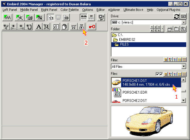 2 - Select the design which you want to sell in "Files:" box in "Right Panel". To select the design, please move mouse pointer to its file name and click the left mouse button (arrow 1 in Picture No. 1).
